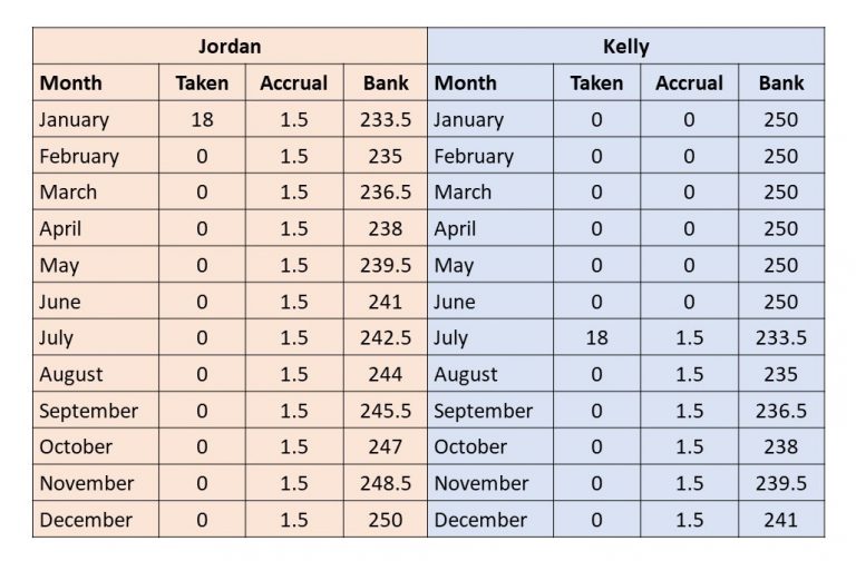 The two examples in the table on this page may help illustrate this. For these two examples, let us assume that both “Jordan” and “Kelly” are carrying 250 sick days in their banks into the new year from December 31.