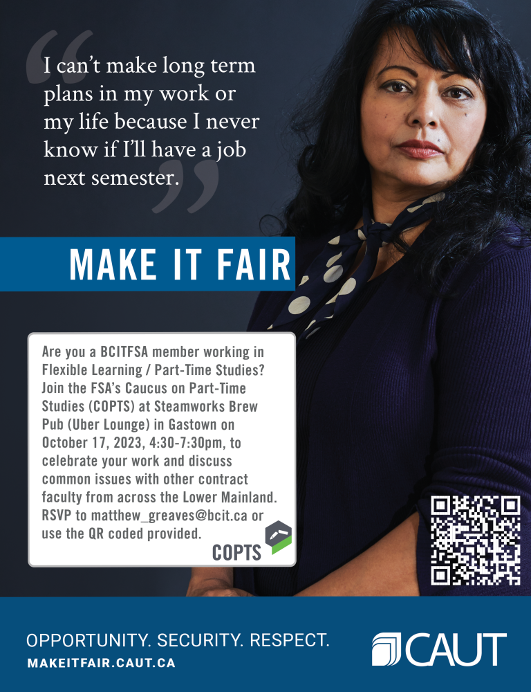 After a pandemic hiatus, the FSA is bringing back its Fair Employment Week (FEW) pub night, open to contract academic staff across the region.* FEW events for contract academic staff are organized by the Canadian Association of University Teachers (CAUT) and member unions like the FSA. This FSA organized event will take place a short distance from BCIT’s Downtown Campus at Steamworks Pub, 4:30-7:30pm, on October 17, 2023. If you’re a PTS member interested in swapping stories, celebrating, and strategizing, please RSVP to Member Engagement Officer Matt Greaves.